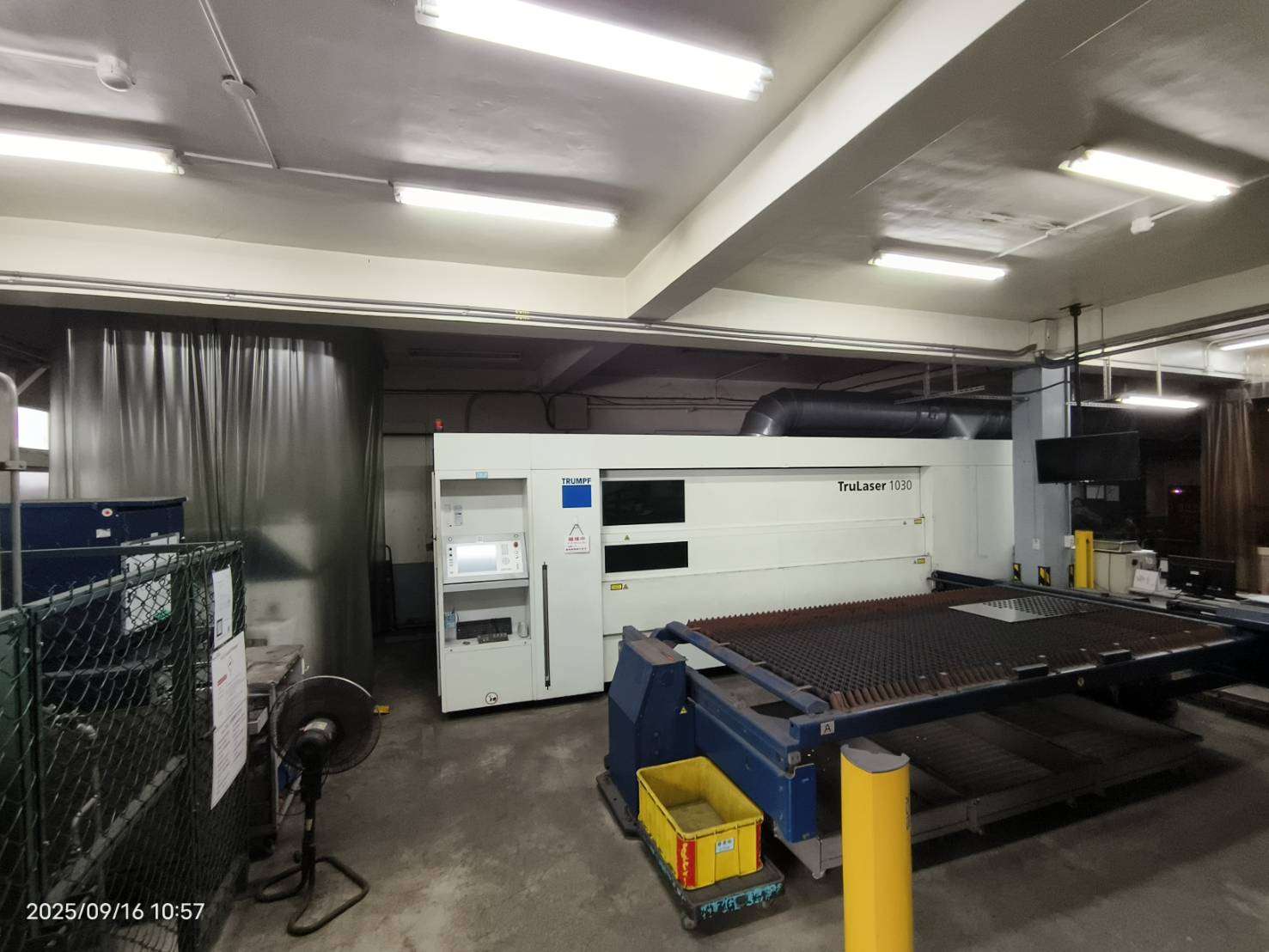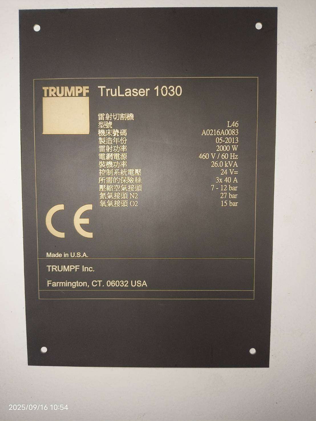 TruLaser 1030 2013 là máy cắt laser được thiết kế để cắt kim loại chính xác trong các ứng dụng công nghiệp. Được sản xuất bởi Trumpf, model này (số sê-ri A0216A0083) có công suất laser 2000W, hoạt động trên nguồn điện lưới 460V/60Hz với công suất lắp đặt 26,0 kVA và sử dụng điện áp hệ thống điều khiển 24V. Máy yêu cầu 3 cầu chì 40A và được trang bị các đầu nối khí nén (7-12 bar), nitơ (27 bar) và oxy (15 bar). Máy được sản xuất vào tháng 5 năm 2013. Lý tưởng cho chế tạo và sản xuất kim loại đòi hỏi độ chính xác cao.