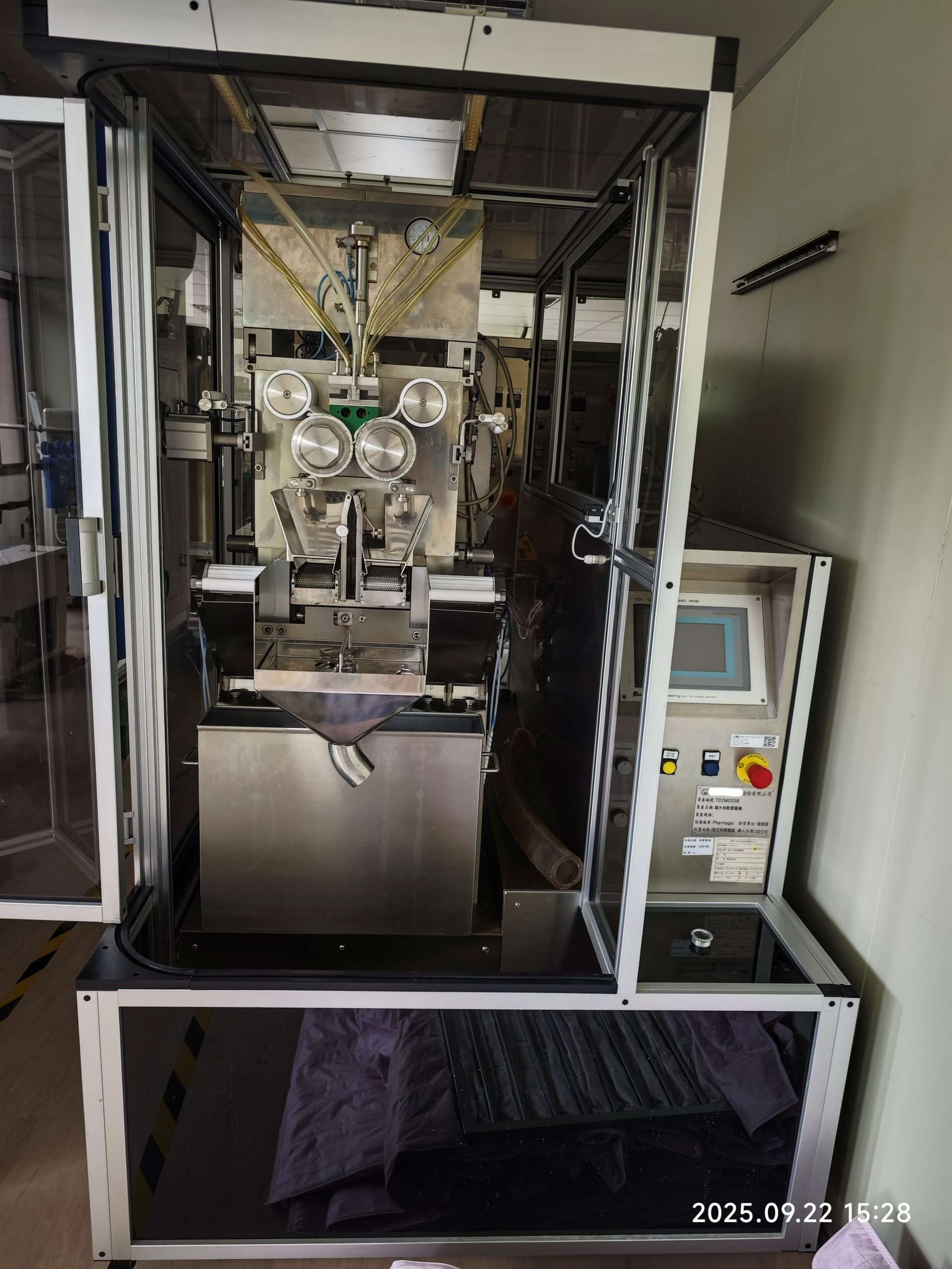 Pharmagel GK39L เป็นอุปกรณ์ซอฟต์เจลสัญชาติอิตาลีที่ออกแบบมาสำหรับกระบวนการห่อหุ้มซอฟต์เจล มาพร้อมตะกร้าอบแห้งขนาด 20 ลิตร ระบบนี้ประกอบด้วยสถานีผสมหลอมสำหรับการผสมกาวและวัตถุดิบ เครื่องบรรจุซอฟต์เจล GK39 Labo (พร้อมคู่มือประกอบ) และอุปกรณ์เสริมอื่นๆ เช่น ชั้นวางอบแห้ง ถาด และโต๊ะตรวจสอบพิเศษ ระบบนี้อยู่ในสภาพพร้อมใช้งาน